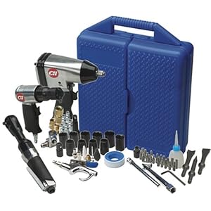 In order for you to get the most out of your air compressor, you need the proper tools. This 19 Piece Tool Kit: Includes 3/8" ratchet, 1/2" impact wrench, 1/2" impact sockets (1/2", 9/16", 5/8", 11/16", 10mm, 12mm, 15mm, 17mm, 19mm, and 21mm) 3/4" - 13/16" SAE flip socket, 3/8" (F)-1/2" (M) socket adapter, 3" extension, (2) 1/4" industrial plugs, air tool oil and carrying case.Price: $139.99